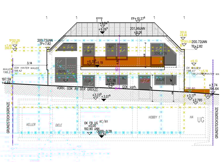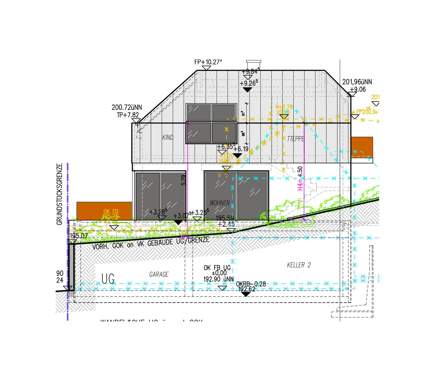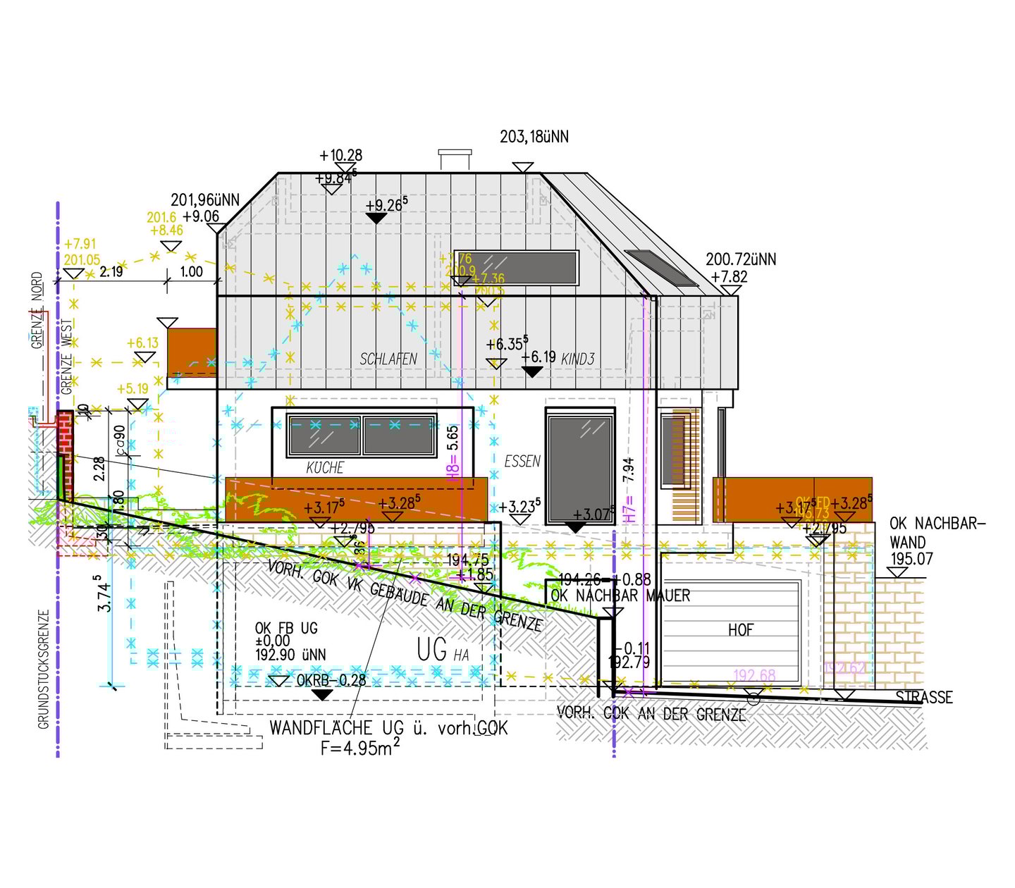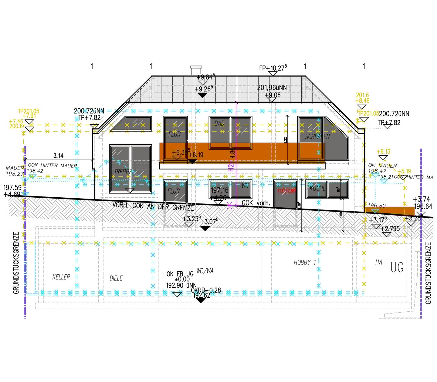 Dargestellt sind Geschosshöhen, Dachform, Geländeverlauf und die konstruktive Einbindung des Baukörpers in das Grundstück.