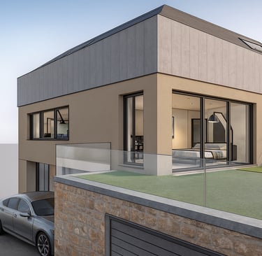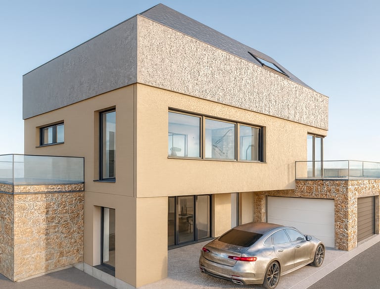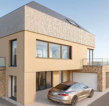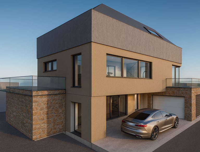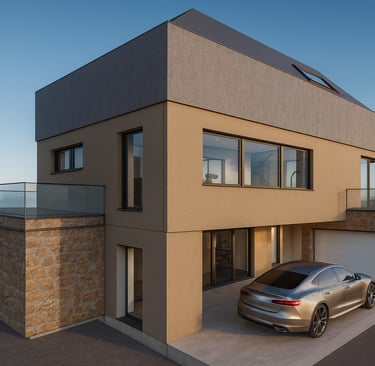 Im unteren Geschoss entstehen helle Räume dank Tageslicht auf der Talseite. Zwei große Hobbyzimmer bieten viele Nutzungsmöglichkeiten, etwa als Arbeitszimmer, Gästezimmer oder Spielbereich. Zusätzlich stehen ein Hausanschluss und Technikraum sowie weitere Kellerräume zur Verfügung. Eine integrierte Garage und ein überdachter Hofbereich sorgen für praktischen Komfort. Der Zugang ins Haus ist direkt oder geschützt über die Garage möglich.