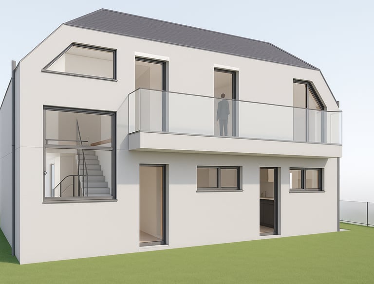 Das obere Geschoss bietet ein Elternschlafzimmer mit Zugang zum Balkon. Drei weitere Zimmer eignen sich ideal als Kinderzimmer, Gästezimmer oder Arbeitsbereiche. Ein helles Familienbad mit Platz für Wanne, Dusche und Doppelwaschtisch sorgt für hohen Wohnkomfort. Der kompakte Flur schafft kurze Wege und eine effiziente Organisation der Räume.